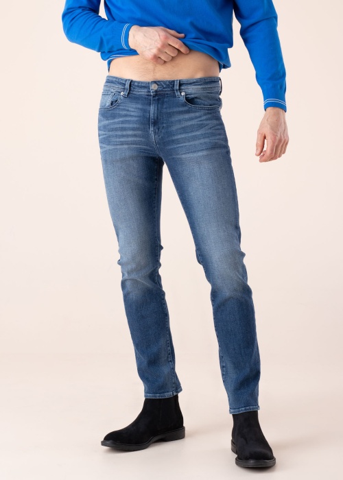 Stilīgi Slim Fit piegriezuma Selected Homme džinsi Leon ir ideāla izvēle valkāšanai ikdienā. Kokvilnas džinsu materiāls ir elastīgs un nodrošina komfortu un mobilitāti . Modelim ar piecām kabatām ir klasiska pogu aizdare un rāvējslēdzējs. Modelis ir 195 cm garš, valkā 32. –34. izmēru.