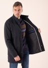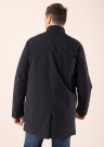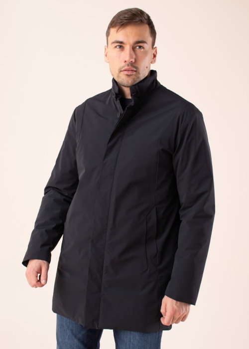 Selected Homme vīriešu apģērbu zīmols pauž kaislību pret izcilu kvalitāti un pielāgotu pieeju, koncentrējoties uz minimālismu. Plēves, neilona virsma ir matēta ar apdari, nodrošinot labu laikapstākļu noturību gan ūdens atgrūšanas, gan vēja necaurlaidības veidā. Moderna mēteļa, ar vertikālu apkakli, virspuse aizdarāma ar rāvējslēdzēju, un to aizsargā pārsegs ar pogām. Sānu kabatas ir atvērtas un piedurknes brīvi krīt. Iekšpuses ķermeņa daļu oderē pārstrādāts poliesters, bet piedurkņu iekšpusi – poliesters, bet siltināšanai izmantotas pārstrādātas poliestera šķiedras. Personīgās mantas ir ērti ievietot krūšu kabatās ar rāvējslēdzēju kreisajā pusē. Papildu kustību brīvību veicina šķēlums ar spiedpogu aizmugurē. Modeļa augums 188 cm, valkā L izmēru. Garums no apkakles līdz apakšmalai 88 cm. Materiāls: neilons 90%, elastāns 10%, odere pārstrādāts poliesters%, piedurkņu odere poliesters 100%, siltinājums pārstrādāts poliesters 100%. Krāsa: melna
