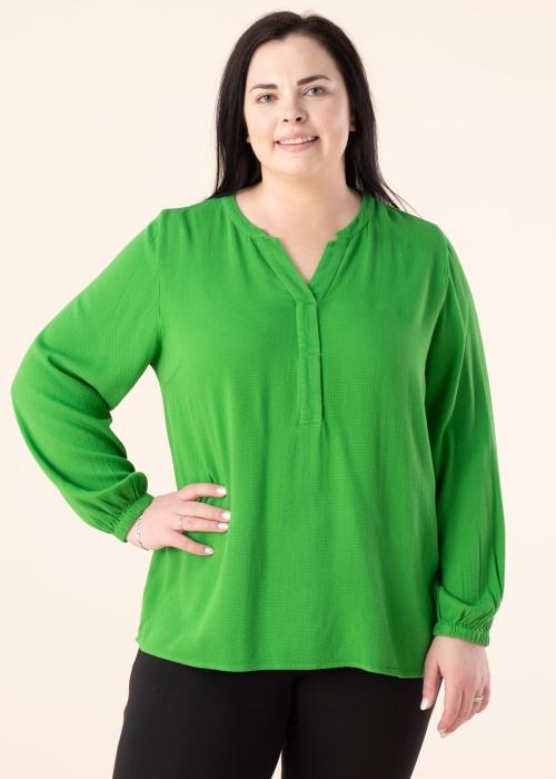 Spilgta Simple Wish blūze rada svaigu un gaumīgu kopskatu. Stilīga un ar V-veida kakla izgriezumu blūze ir brīvi krītoša un mugurpusē ar garāku piegriezumu. piedurkņu galos ir gumijas un efektu piešķir dizaina šuve uz apkakles. LENZING ™ ECOVERO ™ šķiedra, kas iegūta no sertificētiem atjaunojamiem koksnes avotiem, izmantojot videi draudzīgu ražošanas procesu un ievērojot augstus vides standartus. Foto: augums 175 cm valkā 46 izmēru.