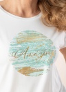 Jauka Soyaconcept blūze der dažāda rakstura dienām. Pieticīga patīkami mīksta blūze ir ar apaļu kakla izgriezumu un labi pieguļoša. Priekšpusi rotā izteiksmīgs drukas attēls , kā arī uz piedurknēm ir atlocīta apdare. Foto: augums 178 cm valkā S izmēru.