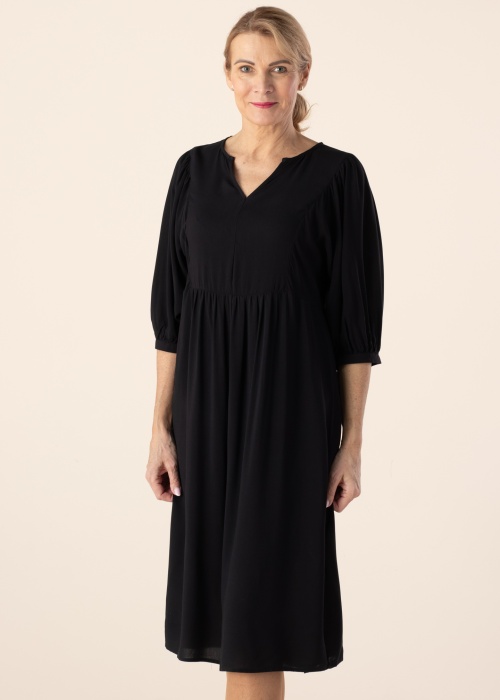 Sievišķīga un ar kuplām piedurknēm Soyaconcept kleita der stilu zinošai sievietei. Prece- brīvi krītoša un ar patīkamu pieskārienu un izgatavota no viskozes. Akcentu piešķir interesants dizains , kā arī pogas piedurkņu galos padara izteiksmīgāku. Stilīga un pārliecinoša izvēle katrai dienai! Foto: augums 178 cm valkā S izmēru.