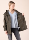 Plaša un skandināvu minimālismu pārstāvoša Soyaconcept pavasara-rudens parka lieliski piemērota valkāšanai ikdienā! Vienkārši griezumi un praktiskums sniedz iespēju valkāt to ar dažādiem tērpiem un stiliem. Virsdrēbe aizdarāma ar klasisku vienvirziena rāvējslēdzēju, uz kura atrodas auduma līste ar spiedpogām. Plašā kapuce, ko papildina regulējamas, elastīgas gumijas, vēsa laika apstākļos pasargās no vēja un aukstuma. Priekšpusē divas atvērtas krūšu kabatas un divas atvērtas priekšējās kabatas. Parku papildina auduma detaļas, minimālistiskajam stilam pievienojot aizraujošu efektu. Piedurkņu gali aizdarāmi ar spiedpogām. Uz zīdaina poliestera iekšējā odera slēpjas iešūts regulējams viduklis, kuru pēc vēlēšanās var pielāgot sev. Modele ir 177 cm gara, valkā S izmēru. Kopējais garums no apkakles līdz apakšmalai 76 cm.