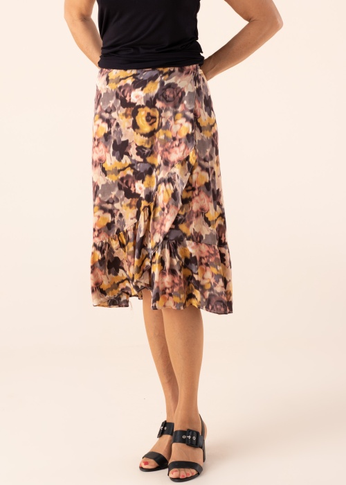 Soyaconcept svārki Darwin, ar raibu rakstu rada izsmalcinātu vizualitāti. Spīdīga un zīdaina auduma svārkiem ir sasienams stils, malā volāns un kreisajā pusē aizdare ar slēpto rāvējslēdzēju. Modeles augums 178 cm, valkā 36. izmēru. Kopējais garums šim izmēram ir 72 cm.