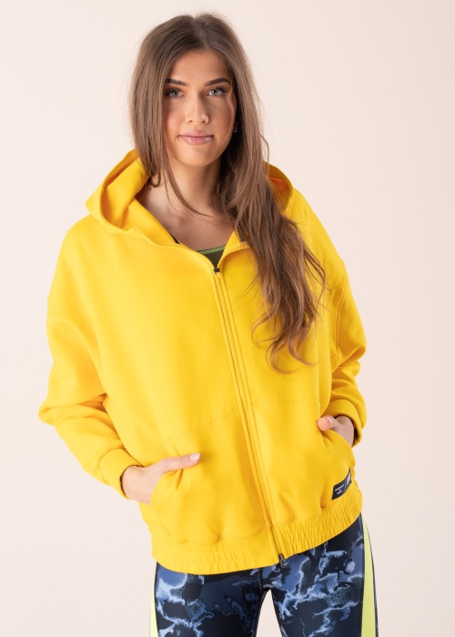 Priecīga, saulaini dzeltena SuperDry zīmola sporta jaka ar trapeces veida piegriezumu, priekšā ir parocīgs rāvējslēdzējs un, ja nepieciešams galvu sargā ērta kapuce. Sānos jaukas kabatas, no kurām atvērtas kabatas un to iekšpusē ir kabata ar rāvējslēdzēju. Piedurkņu galos un apakšmalā ērti plata gumija, kas cieši uztur jaku ap ķermeni. Modeles augums 178 cm, valkā S izmēru.