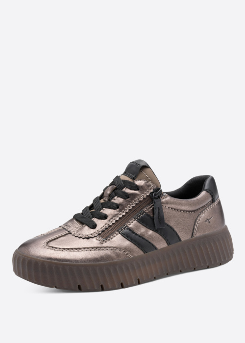 Tamaris Comfort sieviešu brīvā laika apavi ir stilīgi un jauneklīgi, nodrošinot modernu un patīkamu dizainu. Šie apavi ir lieliski piemēroti atpūtai, pateicoties to spīdīgajam izskatam un komfortam. Apavu augšdaļā ir sasienama josta, kas piešķir papildu eleganci un praktiskumu. Sānos ir ērts rāvējslēdzējs un dekoratīvi elementi, kas piešķir apaviem unikālu izskatu. Papēdī ir iestrādāts logo un dekoratīvs elements, kas papildina kopējo dizainu.