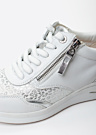 Tamaris Comfort sieviešu ikdienas apavi ir labi piemēroti ikdienas gaitām un ļauj justies patīkami visas dienas garumā. Tie ir arī noderīgi, jo tos var viegli saskaņot ar dažādiem tērpiem, kā arī vilkt gan pastaigās, gan brīžos, kad ir vairāk jākustas. Sportiskais noformējums piešķir apaviem dzīvīgu izskatu un vienlaikus palīdz saglabāt stabilu, drošu soli. Uz apavu mēlītes ir redzams zīmola motīvs, savukārt šņores virspusē ļauj pielāgot piegulumu tieši tā, kā vajag. Sāna iekšpusē iestrādātais elastīgais ielaidums nodrošina labu lokanību, bet purngalu papildina interesants raksts, kas šim modelim piešķir īpašu akcentu.