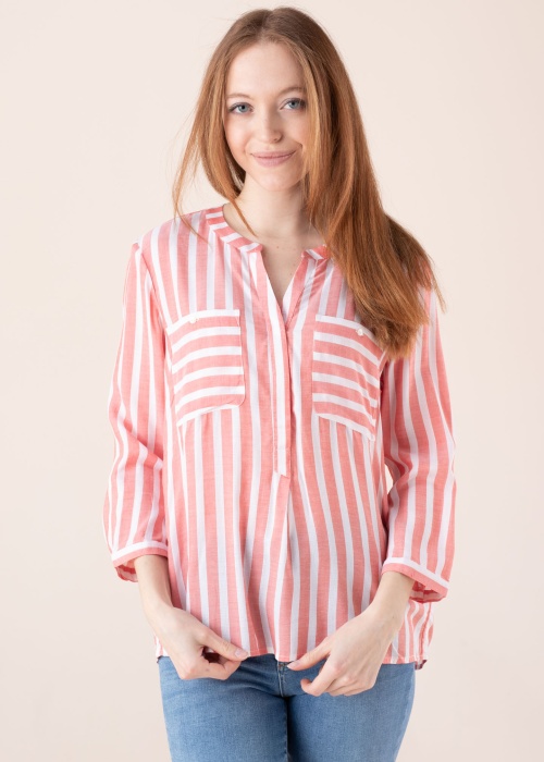 Viegla Tom Tailor blūze der valkāšanai ikdienā. Ar svītrainu rakstu blūze ir ar trīs ceturtdaļu piedurknēm un ar plānāku stilu. Uz apkakles ir pogu aizdare , aizpogājamas kabatas uz krūtīm padara izteiksmīgāku , kā arī piedurkņu galos ir pogas. Saskaņo ar dažādiem apģērbiem un radi jaunus stilus! Foto: augums 174 cm valkā 36 izmēru.