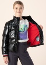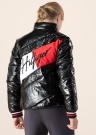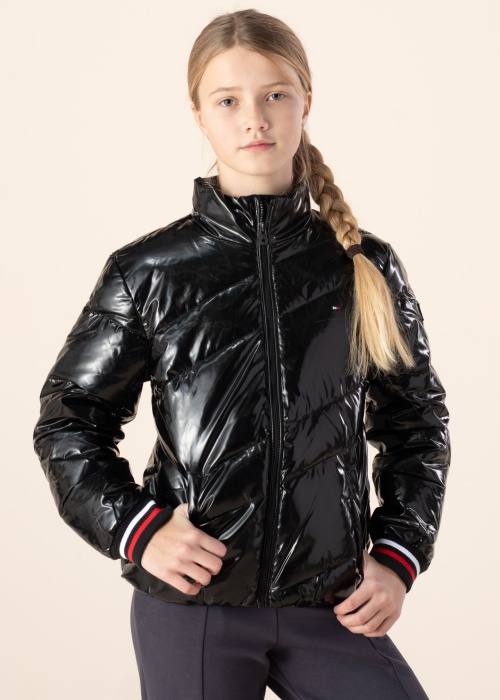 Tommy Hilfiger ziemas virsjaka ar hologrāfisku spīdumu melnā krāsā ir lieliska izvēle aktīvai meitenei. Stepēta stila jakai ir patīkami plašāks piegriezums. Jaka priekšpusē aiztaisāma ar ērtu rāvējslēdzēju. Aproču galus ieskauj valnīši, kas ļauj aproču galiem ērti aptīties ap plaukstas locītavu un efektīvi nēsāt zīmolam raksturīgos krāsu toņus. Jakas augstākā apkakle ērti turas ap valkātāja kaklu, palīdzot novērst aukstuma iekļūšanu jakā. Ir divas kabatas, kuras var aizvērt ar pogu sānos, kas ir ideāli piemērotas roku sasilšanai. Zīmola logo, atrodas uz krūtīm un kreisās apkakles augšpusē, un lielāks dizains, kas attiecas uz zīmolu, rotā muguru. Iekšējā virsma ir pārklāta ar patīkami mīkstu audumu, kas piedāvā lielisku komfortu. Modeles augums ir 153 cm un valkā 152. izmēru. Dotā izmēra jakas aizmugures garums ir 54 cm. Materiāls: poliesters 100%, pildījums - poliestera šķiedra 100%. Krāsa: spīdīgi melna.