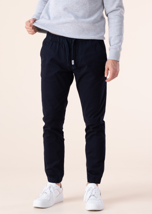 Tīra stila Tommy Jeans bikses der brīvā laika pavadīšanai. Slim Fit piegriezuma bikses ar elastīgu jostasvietu un no izturīga auduma. uz jostas ir tuneļa aukla , priekšpusē un aizmugurē ir atvērtas kabatas, kā arī bikšu galos gumijas. Foto: augums 188 cm valkā L izmēru.