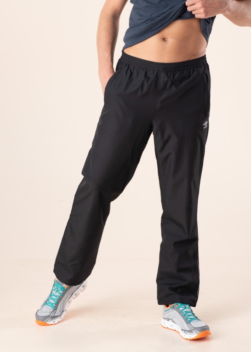 Vienkārša dizaina Umbro bikses Chip ir lieliskas valkāšanai brīvā laikā. Nova micro audums nodrošina komfortu un vienkāršu kopšanu. Jostas daļa ir patīkami elastīga un stabili turas ap valkātāja ķermeni, iekšpusē regulējama ar auklu. Sānos ar rāvējslēdzēju aizdarāmas kabatas, kurās ērti glabāt svarīgus priekšmetus, atrodoties ārpus telpām. Zem kreisās kabatas atrodas zīmola logo ar atstarojošu efektu. Stulmu galos gumija, ko iespējams regulēt. Ārējās malās atstarojošas lentes. Iekšējo virsmu klāj patīkams, tīklveida audums, kas veicina elpojamību. Modeļa augums 193 cm, valkā L izmēru. Materiāls: poliesters 100%. Krāsa: melna.