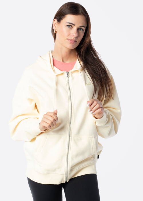 Vans sieviešu sporta jaka Everyday ir lieliska izvēle ikdienas aktivitātēm, jo tā ir komfortabla un mīksta. Jaka ir aprīkota ar kapuci un tai ir brīvs piegriezums, kas nodrošina papildu ērtības un stilīgu izskatu. Modeles augums ir 176 cm un viņa valkā S izmēru.