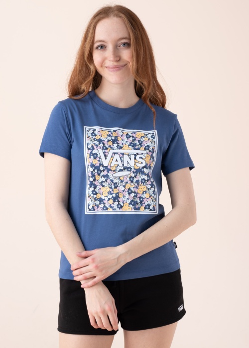 Vasarīgs Vans T krekls. Klasiskā T-krekla priekšpusē atrodas drosmīgs zīmola logo ar ziedu rakstu, elastīga, apaļa apkakle perfekti pieguļ valkātāja kaklam. Mīkstā un ādai draudzīgā kokvilna mugurā ir patiesi ērta. Modeles augums 174 cm, valkā S izmēru. Materiāls: kokvilna 100%. Krāsa: zila.