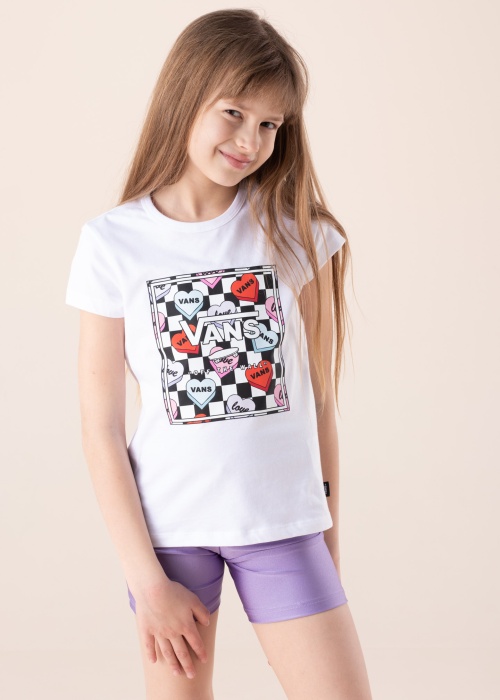 Šis Vans T-krekls ir paredzēts meitenei, kurai patīk vienkārša mode un dizains. Priekšpuse ir ilustrēta ar apdruku, kas attēlo zīmola kvadrātveida rakstu, un jaukas sirsniņas ar zīmola uzrakstiem. Kokvilnas audumam ir patīkami mīksts pieskāriens ādai un ļoti laba noturība. Modelis ir 142 cm garš un valkā S izmēru. Materiāls: 100% kokvilna. Krāsa: balta.