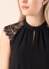 Vero Moda sievišķīgā blūze ir piemērota gan ikdienas nēsāšanai, gan svētkiem. Blūze, kas izgatavota no daļēji pārstrādātiem materiāliem, ir viegli kombinējama gan ar biksēm, gan svārkiem. Plecu daļu rotā smalkas, skaistas mežģīnes. Aizmugrē aizverama ar divām pogām. Modeles garums ir 170 cm, tā nēsā S izmēru. Materiāls: poliesters 95%, elastāns: 5%. Krāsa: melna.