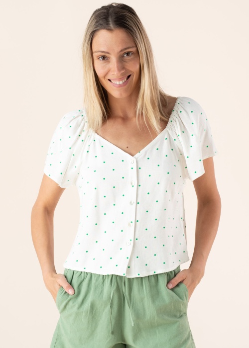 Burvīga Vero Moda blūze der valkāšanai vasarā. Sievišķīga un ar īsāku piegriezumu blūze ir ar punktainu rakstu un plāna. Priekšpusē ir pogu aizdare , kā arī [] uz pleciem padara izteiksmīgāku. LENZING ™ ECOVERO ™ šķiedra, kas iegūta no sertificētiem atjaunojamiem koksnes avotiem, izmantojot videi draudzīgu ražošanas procesu un ievērojot augstus vides standartus. Foto: augums 177 cm valkā S izmēru.