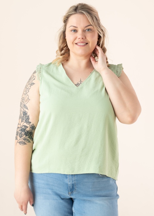 Jauks Vero Moda Curve tops der vasaras dienu baudīšanai. Jauks ar V-veida kakla izgriezumu tops ir bez piedurknēm plāns un brīvi krītošs. Uzmanību piesaistošas mežģīne uz pleciem. Foto: augums 167 cm valkā 46 izmēru.