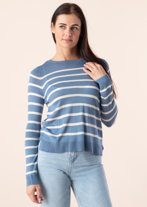 Lietišķs Vero Moda džemperis valkāšanai ikdienā mājās, darbā, kā arī brīvdienās. Jauks un ar svītrainu rakstu džemperis ir plāns un viegls. Piedurkņu galos un apakšmalā ir valnīši. Izgatavots videi draudzīgā veidā, un krāsas sasniegšanai izmantota Wiser Wash tehnoloģija, kur netiek izmantotas klasiskās ķimikālijas un ūdeni patērējošas metodes. Foto: augums 176 cm valkā S izmēru.