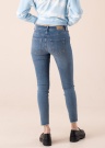 Šīs, modernās Vero Moda džinsu bikses Peach ar vidēju Mid Rise jostas daļu ir lieliski piemērotas valkāšanai ikdienā. Šaurāks Skinny piegriezums ļauj biksēm skaisti izcelt valkātājas figūru, bet īsāks Ankle Cut staru garums piešķir individualitāti. Priekšpusē tās ērti aizdarāmas ar pogu un rāvējslēdzēju, un modelim kopumā ir piecas kabatas, no kurām trīs ir priekšpusē un divas aizmugurē. Uz ceļgala zonas bikses nodilušā stilā, bet stulmu galos plīvo efektīgas, izteiksmīgas bārkstis. Audumam raksturīgs lielisks mīkstums un laba elastība, kas nodrošina komfortu arī aktīvāk pārvietojoties. Modeles augums 174 cm, valkā S-32 izmēru