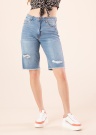 Vero Moda džinsa stila šorti ar vienkāršu piegriezumu un ilgāku darbību ir moderni un ērti. Augstākā jostasvieta izceļ lietotāja vidukli. Priekšpusē tie ir aizvērti ar rāvējslēdzēju, kas nostiprināts ar vara pogu. Divas kabatas priekšpusē, viena ar nelielu atslēgu kabatu labajā sānu kabatā. Bikses valkātā džinsa stilā, uzplēstas detaļas abās kājās un bārkstis apakšā. Aizmugurē ir divas lielas aizmugurējās kabatas. Modelis ir 174 cm garš un valkā S izmēru. Materiāls: 100% kokvilna. Krāsa: zila