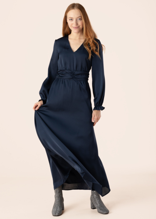 Vero Moda sieviešu kleita ir eleganta un izsmalcināta, ar V-veida kakla izgriezumu un garām piedurknēm, kas piešķir tērpam klasisku šarmu. Kleitai ir izcelts viduklis un plīvojošs siluets, ar gumiju piedurkņu galos un rāvējslēdzēju kreisajā sānā, kas padara to viegli uzvelkamu. Dekoratīvā detaļa viduklī piešķir kleitai unikālu akcentu, un modeles garums ir 174 cm, valkājot S izmēru.
