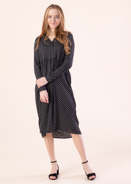 jauki punktota Vero Moda kleita Fie ir izgatavota no labi krītošas, elpojošas un videi draudzīgas viskozes. Klasisko atloku kleitas priekšpusē ir pogu aizdare līdz viduklim un garo piedurkņu galos arī pogu aizdare. Modeles augums 174 cm un valkā S izmēru.