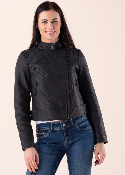 Moderna un stilīga Vero Moda mākslīgās ādas jaka lieliski piemērota valkāšanai ikdienā! Jaka aizdarāma ar vienvirziena rāvējslēdzēju, efektīga apkakle aizdarāma ar spiedpogu. Priekšpusi rotā trīs kabatas ar rāvējslēdzēju, no kurām viena ir mazāka. Stepētās zonas uz pleciem un elkoņiem piešķir apģērbam izturību. Apakšmalu sānos spiedpogas. Mīksta un zīdaina poliestera odere, kas nodrošina komfortu. Modele ir 176 cm gara, valkā S izmēru. Kopējais garums no apkakles līdz apakšmalai 48 cm.
