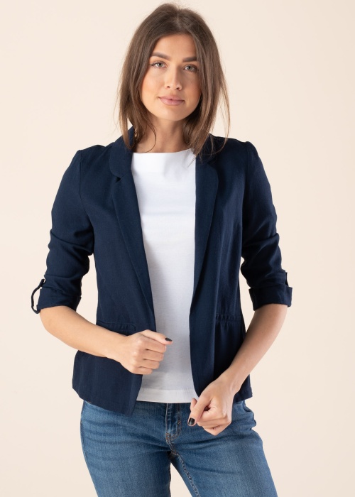 Vasarīga Vero Moda žakete der valkāšanai ikdienā. Ar plānāku stilu viegla žakete ir ar atlokamu apkakli un ar trīs ceturtdaļu piedurknēm. Priekšpusē ir bez sastiprinājuma , sānos ir kabatu imitācija , kā arī efektu piešķir atlocīta apdare uz piedurknēm. Saskaņo ar dažādiem apģērbiem un radi jaunus stilus! Foto: augums 178 cm valkā S izmēru.