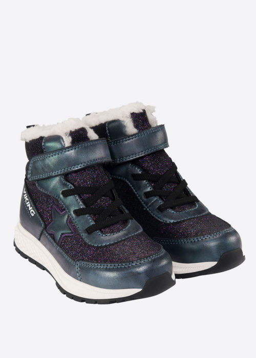Viking meiteņu ziemas zābaki Equip Star ir lieliski piemēroti ikdienas lietošanai, jo tie ir viegli un komfortabli. Šie zābaki ne tikai nodrošina siltumu, bet arī atgrūž ūdeni, tādējādi saglabājot kājas sausas pat mitros laikapstākļos. Zābaku dizains ir meitenīgs un mirdzošs, ar dekoratīviem elementiem sānos un papēdī, kas piešķir tiem īpašu pievilcību. Priekšpusē ir klipsis un elastīgas auklas, kas nodrošina ērtu un drošu valkāšanu, savukārt sānos ir redzams zīmola logo, kas apliecina to kvalitāti.