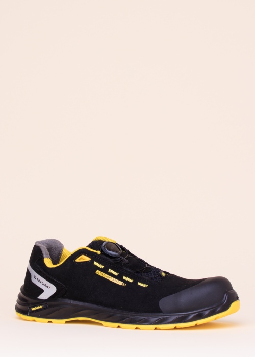 Kvalitatīvi vīriešu darba apavi nodrošina komfortu un aizsardzību pret riskiem darba vidē. Virspuse ar ūdeni atgrūdošu apdari izgatavota no kvalitatīvas zamšādas, kas nodrošina izturību. Drošības apavu purngals un papēža daļa ir pastiprināta, nodrošinot pēdas stabilitāti un papildu aizsardzību. Virspusē ir raksturīga laba elpojamība, ļaujot valkātājam justies komfortabli valkāšanas laikā. Kājās tie nostiprinās AR BOA Tamila sistēmu, kuras stiprināšanai jāpagriežas pulksteņrādītāja virzienā un atslābināšanai jāpavelk uz augšu un jāpagriež pretēji pulksteņrādītāja virzienam. Iekšpusi klāj tekstils, kas ļauj pēdai elpot. Iekšzole nodrošina lielisku mīkstumu un komfortu, valkājot arī visas darba dienās garumā. Izstrādājot antistatisko zoli, ir ņemta vērā valkātāja pēdas forma. Zole ir izgatavota no viegla poliuretāna putupoliuretāna, kas pārklāta ar augstas kvalitātes tekstilu. Antistatiskā zole ir izturīga pret degvieleļļu iedarbību un neslīd, nodrošinot noturību uz dažādām virsmām. Apavi aizsargā pret elektrošoku un ir izturīgi pret caurduršanu. Turklāt ir garantēta aizsardzība pret triecieniem. Izmērs 46 zābaku svars 564 g. Krāsa: melna/dzeltena. Iesakām izvēlēties vienu izmēru lielāku apavu pāri.