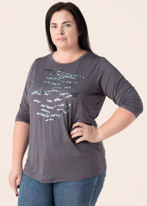Wasabiconcept sieviešu blūze Sibille ir stilīgs un komfortabls tērps, kas lieliski piemērots ikdienas valkāšanai. Tai ir piedurknes līdz elkonim un apaļš kakla izgriezums, kas piešķir eleganci, savukārt spīdīgie fliteri priekšpusē piešķir nelielu mirdzumu. Blūze ir izgatavota no elastīga un brīvi krītoša materiāla ar patīkamu pieskārienu. Modeles garums ir 167 cm un viņa valkā 46-48 izmēru.